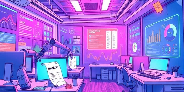 Processamento automatizado de faturas por meio de algoritmos de IA que extraem dados como código de barras, data de vencimento e valor total.